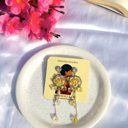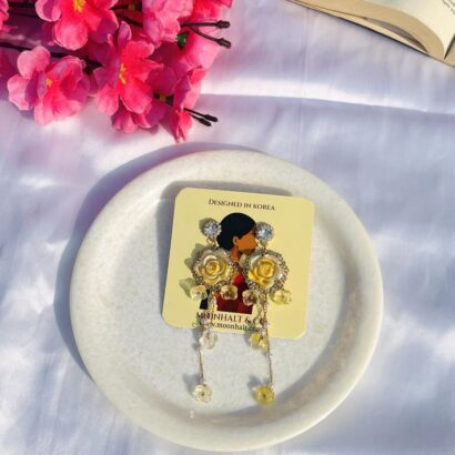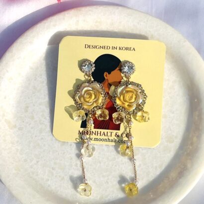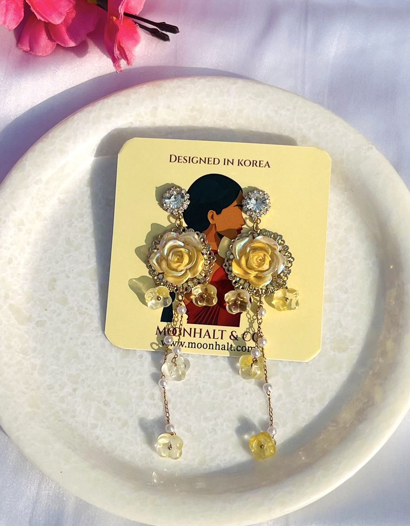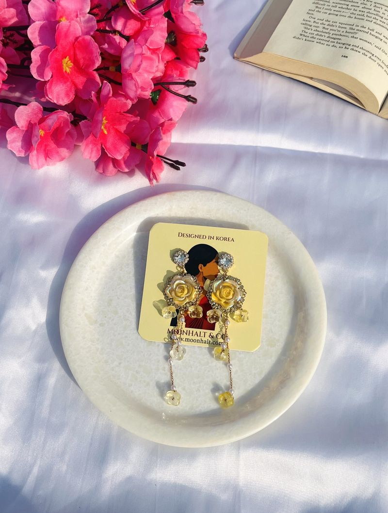 The Golden Blossom Cascades by Moonhalt & Co. are a celebration of grace and artistry. These stunning earrings feature radiant yellow rose motifs surrounded by glimmering crystals, exuding a warm and luxurious glow. The cascading chain of translucent flower charms and delicate pearl accents add depth and movement, making them perfect for weddings, celebrations, or adding a sophisticated touch to any outfit. Thoughtfully crafted with anti-tarnish materials and hypoallergenic posts, these earrings offer enduring beauty and exceptional comfort. Elevate your style with the exquisite craftsmanship of these versatile statement earrings.