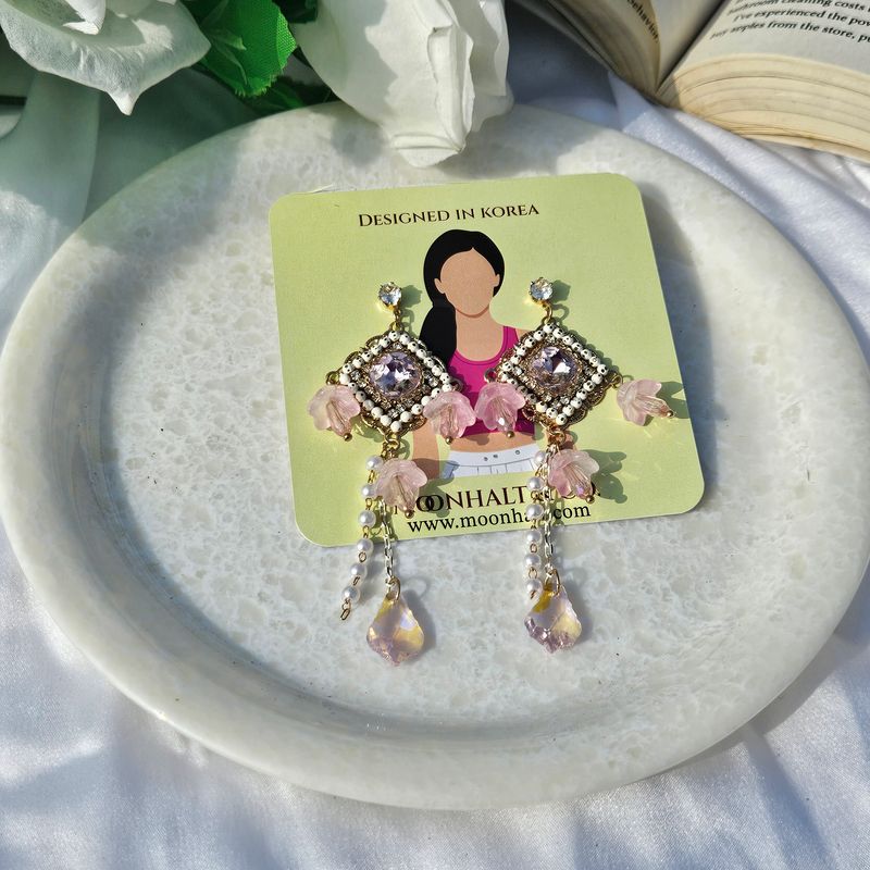 Embrace timeless elegance with the Petal Elegance Drop Earrings, featuring soft pink floral accents, sparkling crystal embellishments, and graceful pearl-draped chains for a sophisticated charm.