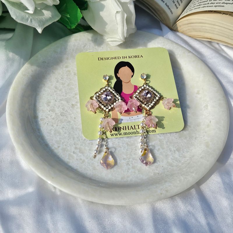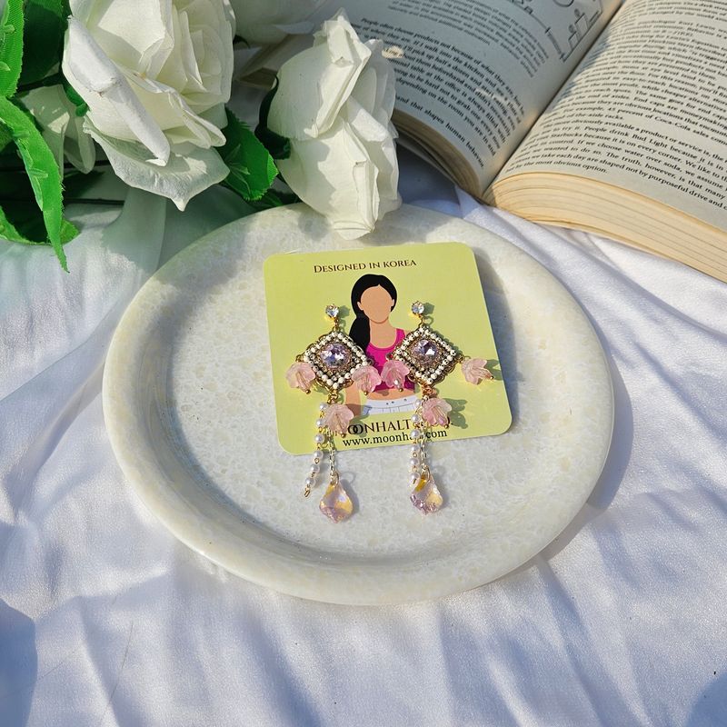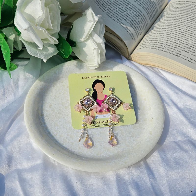 The Petal Elegance Drop Earrings by Moonhalt & Co. combine refined beauty with intricate craftsmanship to create a statement piece inspired by blooming florals. These earrings feature delicate pink floral motifs set against a sparkling square crystal centerpiece, surrounded by gold-plated accents for a luxurious touch. Cascading pearl and crystal chains enhance their graceful design, adding movement and brilliance to your look. Lightweight and comfortable, these earrings are perfect for weddings, festive occasions, or adding a romantic flair to everyday wear. Let these earrings elevate your style with their dreamy and feminine essence.
